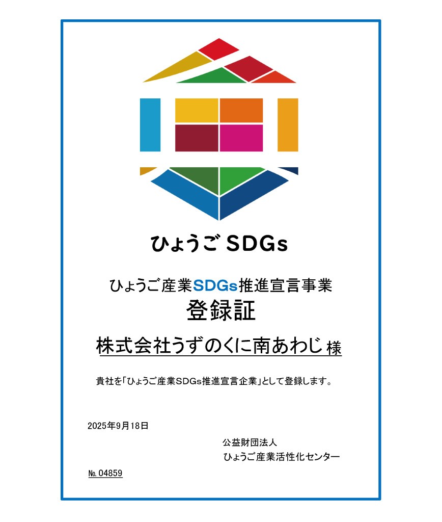 この度、兵庫県が実施している「ひょうご産業SDGs推進宣言企業」に株式会社うずのくに南あわじが登録されました。
